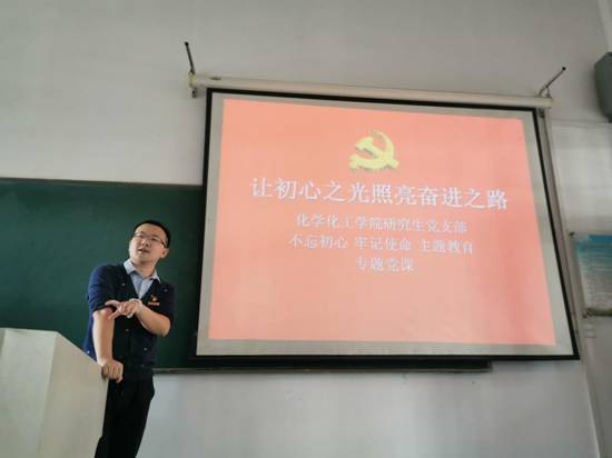 随后,支部书记赵健给全体党员上了题为《让初心之光照亮奋进之路》的专题党课。赵老师强调,“不忘初心、牢记使命”是在我们党领导中国人民进行新的伟大长征的关键历史节点,在中国由大向强发展的关键历史阶段,习近平总书记对全党最严肃也最真切,最深刻也最平实,最重要也最明确的政治提醒和政治要求,它源于对我们党的性质宗旨、历史经验和优良传统的宏大思考,是对我们党进入新时代、踏上新征程、迎接新挑战的战略动员。党课从让初心之光照亮奋进之路,就是要在弘扬“红船精神”、把握先进之源中谱写时代凯歌;让初心之光照亮奋进之路,就是要在高举伟大旗帜、推进理论武装中谱写时代凯歌;让初心之光照亮奋进之路,就是要在增强党性修养、践行根本宗旨中谱写时代凯歌;让初心之光照亮奋进之路,就是要在攻坚克难求作为、闯关夺隘敢斗争中谱写时代凯歌。四个方面做了详细讲述!全体党员同学受益匪浅�