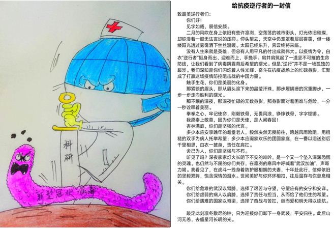 开展疫情防控主题线上作品创作与宣传活动,组织创作了“武汉加油”、“武汉待到春暖花开我们带你品尝这里的美味”、“给抗疫逆行者的一封信”等作品,为武汉加油,为湖北加油,为中国加油。通过作品展现抗击疫情过程中的感人故事和大爱精神,运用抗击疫情这一爱国主义教育实践教材,激发学生爱党爱国爱社会主义的巨大热情。