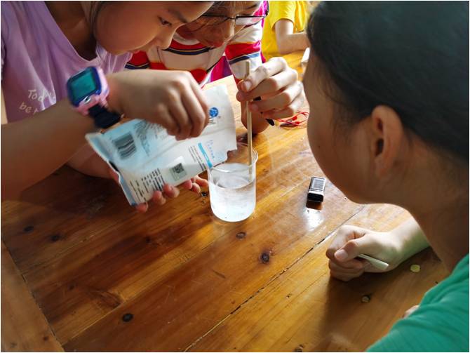 第二个实验由小组成员阮佳鑫主讲,其他三位成员进行配合。前段时间,新冠疫情肆虐,84消毒液突然成为“抢手货”,这次我们就叫大家如何制作在家就能完成的简易84消毒液。小阮老师先演示制作过程,小朋友们分组在我们的帮助下亲自动手制作,并提醒同学们注意观察实验中的现象,思考、猜测原因,最后由小阮老师进行解答。