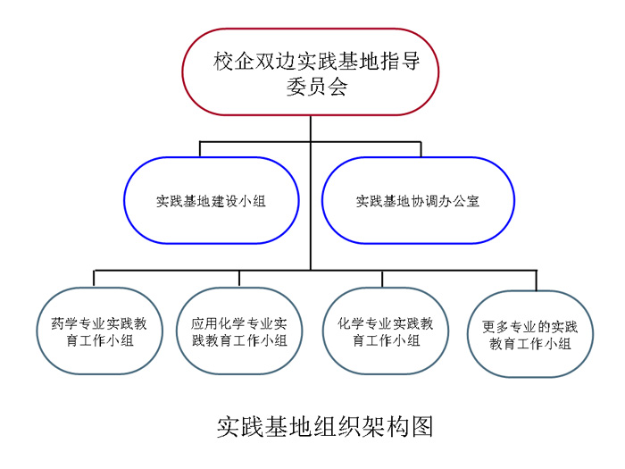 领导和企业领导组成的校企双边实践基地指导委员会负责全面工作,审核实践教学计划,领导实践基地全体人员完成各项工作,督促建设进度。基地建设小组由实践教学项目的负责人和浙江医药股份有限公司人事部门负责人组成,负责实践基地的日常实践教学、行政事务和管理工作,实践基地协调办公室负责日常行政、后勤保障和协调组织工作;同时,基地成立由学院相关专业教师、企业专业工程技术人员、班组长、车间主管、车间(实验室)主任组成的工作小组,做到实践教学人员、实践计划彻底落实,并定期开展实践教学研究活动,提出基地的发展方向、目标、任务,改进实践教学方法,提高教学质量。组织管理体系框架见图。